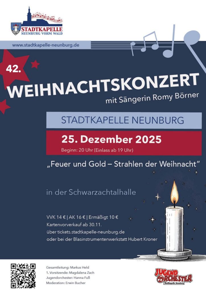 Wenn sich am 1. Weihnachtsfeiertag die Türen der Schwarzachtalhalle öffnen, ist es wieder so weit: Die Stadtkapelle Neunburg vorm Wald lädt zu ihrem traditionellen Weihnachtskonzert ein. Bereits zum 42. Mal verwandeln rund 60 Musikerinnen und Musiker unter der Leitung von Markus Held den Konzertsaal in ein Meer aus Klang, Emotion und festlicher Stimmung.